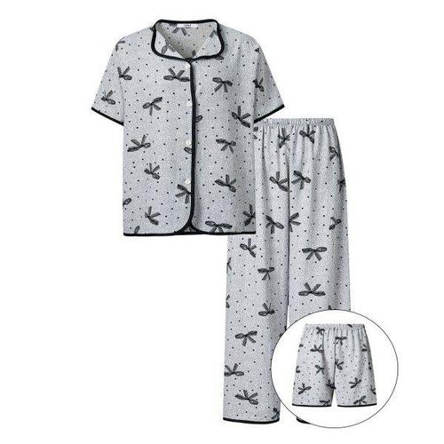 쉬블림로브 3피스(반팔+반바지+긴바지) 여성 홈웨어 리본 패턴 잠옷 세트 GGWD0486