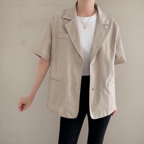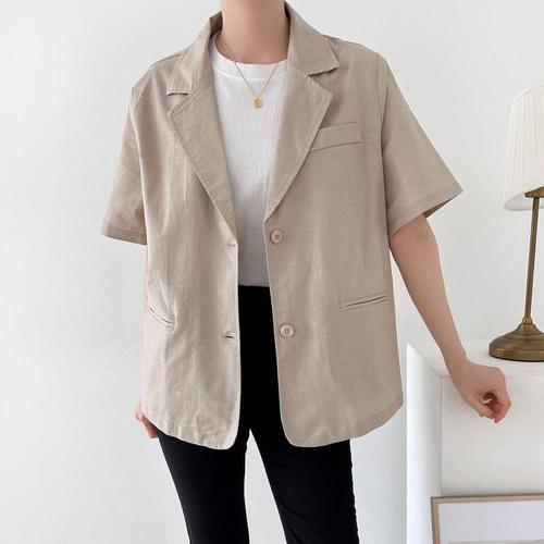 [옷자락] 여자 오피스룩 버튼 카라넥 반팔 오버핏 린넨 자켓