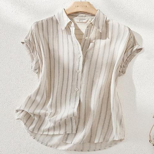 [신상오픈런]여성용 면 리넨 스트라이프 카라 반팔 블라우스