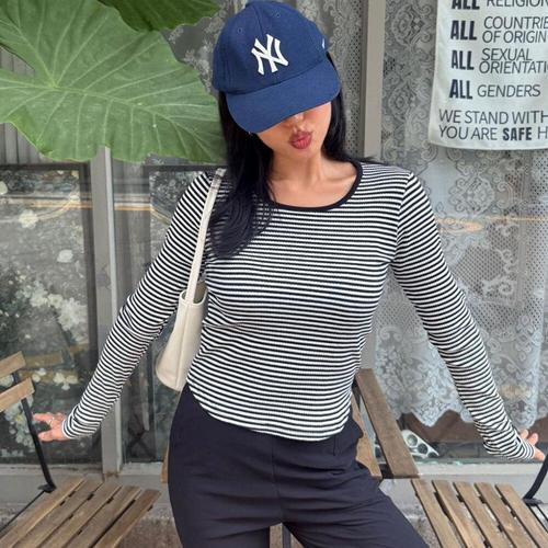 [옷자락]여자 링거티셔츠 단가라 슬림핏 굴림 가을긴팔 티셔츠