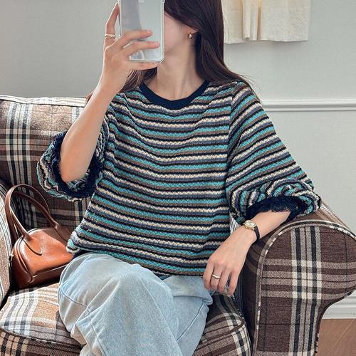 [옷자락]여자 레이스 벌룬 칠부 배색 단가라 링거 박시 티셔츠