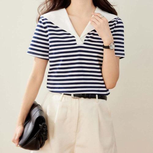 [에이치플러스몰]여성 스트라이프 마린 반팔티 1P 세일러 카라 티셔츠