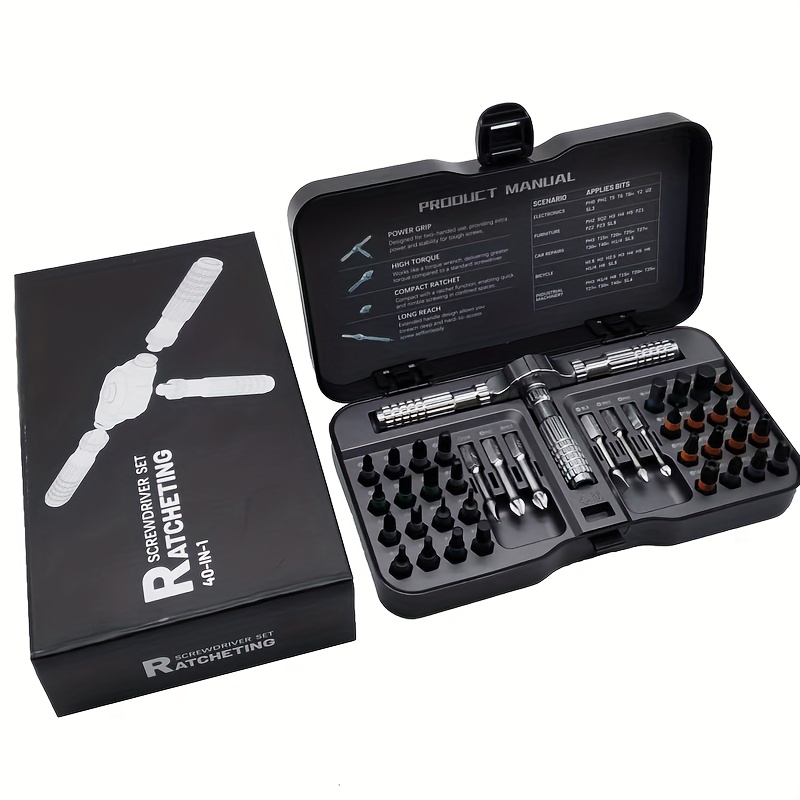 TEMU 40-in-1 라쳇 렌치 스크루드라이버 세트 (T-Bar & S2 비트 시스템 포함) - 헤비 듀티 알루미늄 합금 구조, 42-in-1 다기능 공구 키트 (42개 비트 포함, 크로스 & 육각 헤드), 가정, 자동차, 배관 작업용