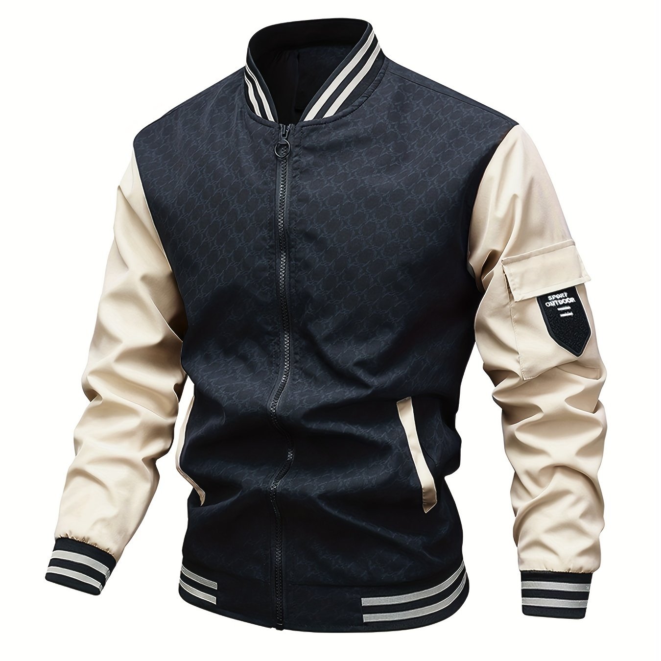 TEMU 남성용 경량 베이스볼 재킷 - 슬림핏 지퍼업 코트, 블랙/베이지 컬러블록, 프론트 지퍼 클로저, 캐주얼 & 포멀 웨어, 봄/가을 아우터웨어, 트렌디한 프린트 디자인, 내구성 있는 소재, 스트리트웨어 애호가를 위한 레이어링 가능