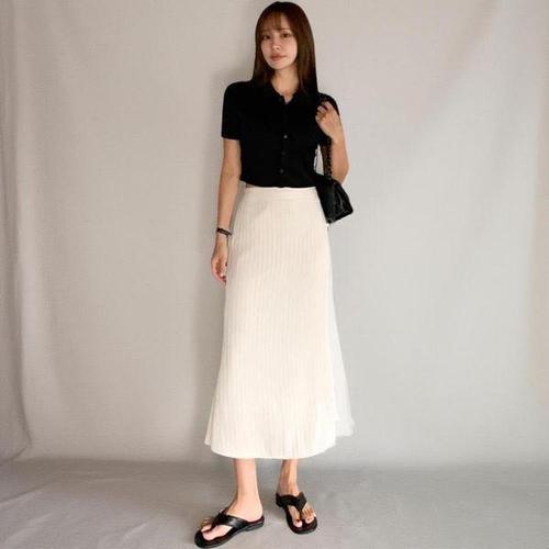 에르디테 / 에르디테 머메이드 밴딩 프릴 캉캉 롱 스커트 화이트 블랙 코디