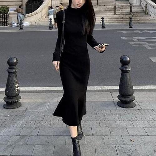 [에이치플러스몰]블랙 머메이드 니트원피스 슬림핏 롱기장 디자인