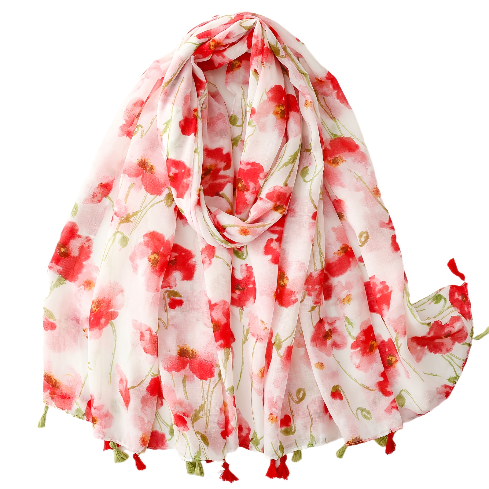 TEMU 여성을 위한 얇은 스카프, 발리 스타일의 숄 디자인으로, 핑크색에 작은 꽃과 태슬이 달려 있어 산뜻하고 달콤한 countryside 디자인을 특징으로 하며 여행에 완벽합니다.