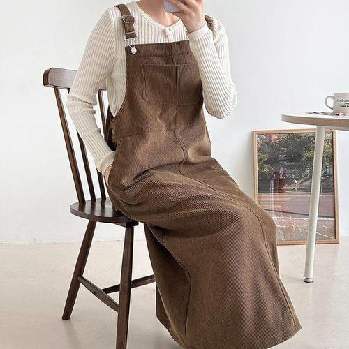 [다잇템_패션]여자 골덴멜빵 박시핏 주머니 슬릿 롱원피스