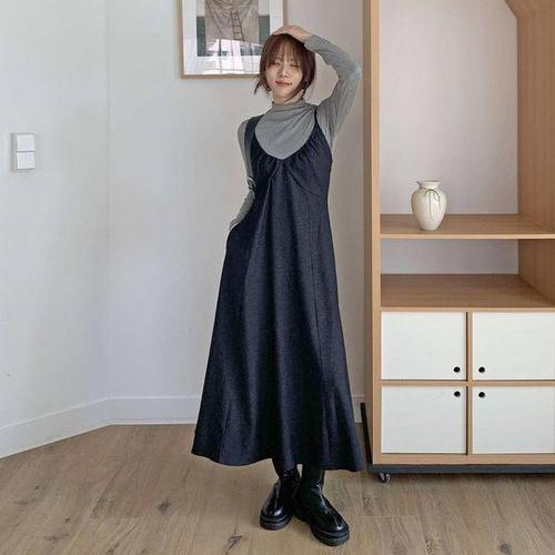[옷자락]여자 코튼 목폴라 티셔츠 뷔스티에 롱 원피스 세트