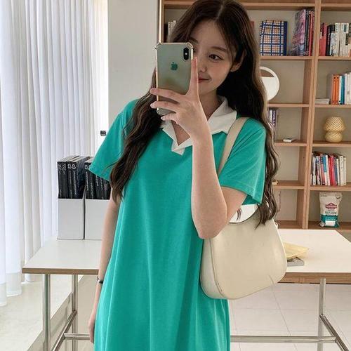 [다잇템]여성 롱 코튼 미니멀리즘 카라넥 반소매 원피스