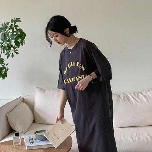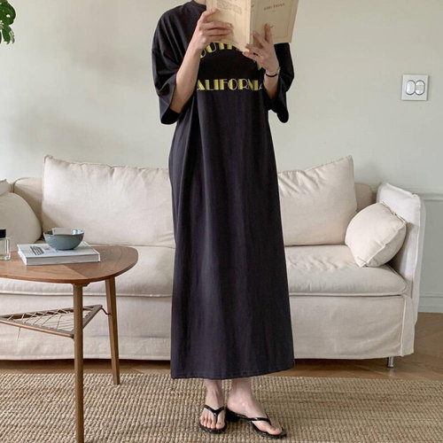 [신상오픈런]여성용 루즈핏 코튼 반팔 롱 원피스 레터링 디자인