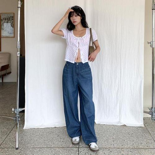 [옷자락] 여성 코튼 리본 스트랩 펀칭 트임 반팔 블라우스