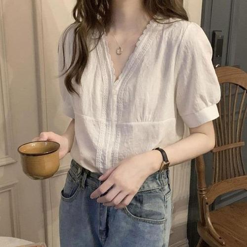 [엄지척]화이트 브이넥 레이스 면 반팔 블라우스 여름 시원한_19645854_667501