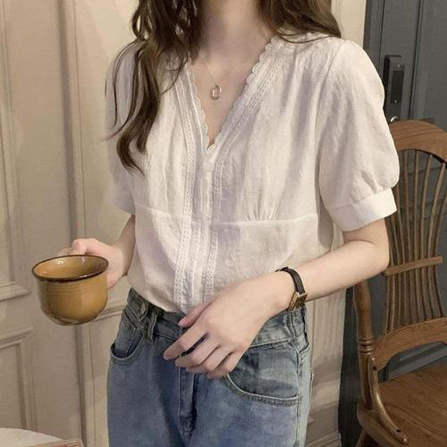 [셀럽하우스]화이트 BICP2820 브이넥 레이스 면 반팔 블라우스 여름 시원한