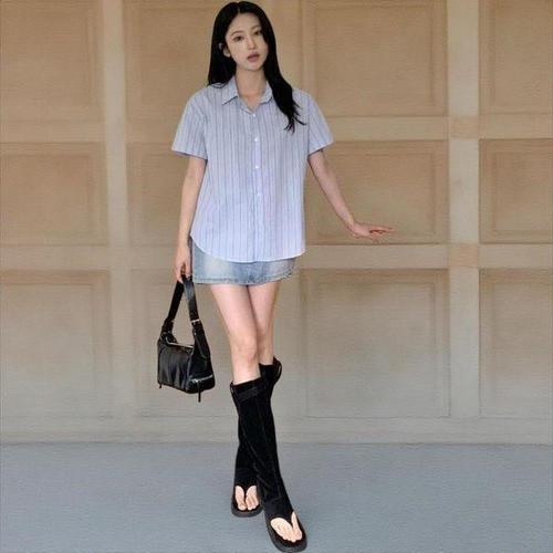 [신상오픈런]여성 루즈핏 스트라이프 반팔 셔츠 면혼합 블라우스