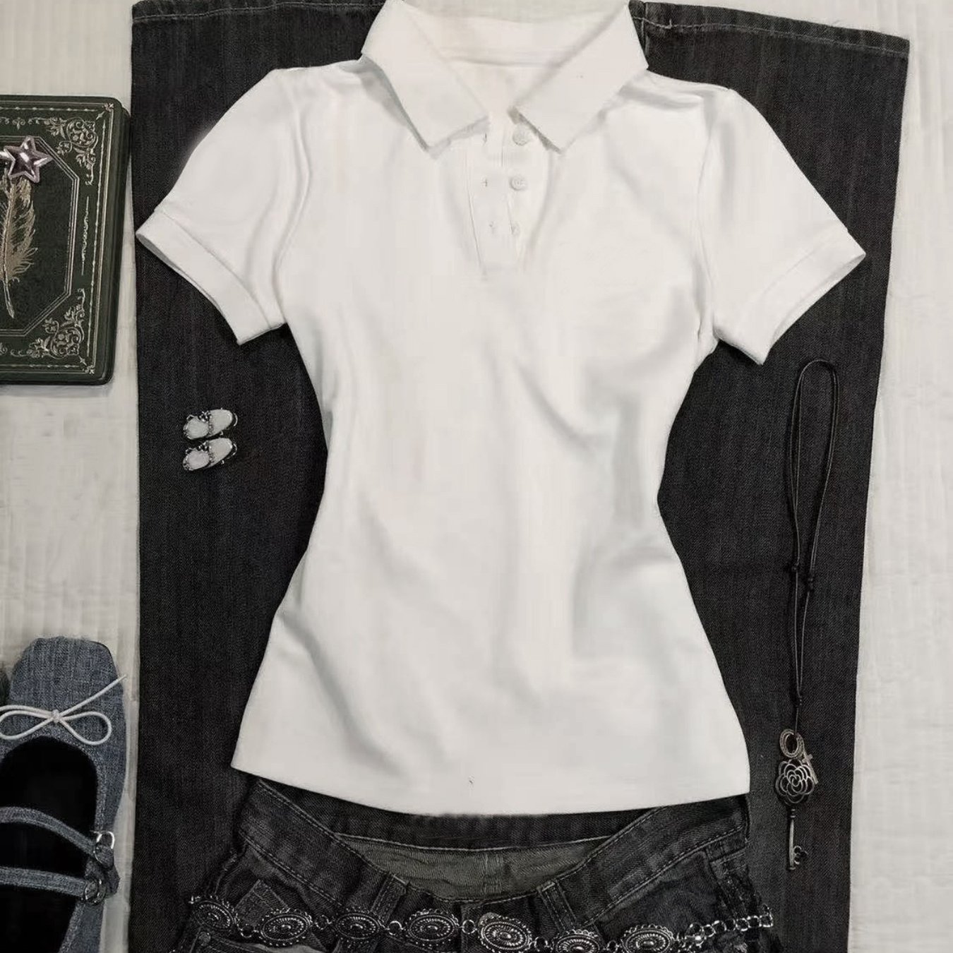 TEMU 여성 Y2K 스타일 V넥 반팔 폴로 셔츠 - 반팔, 핏 디자인, 레터 프린트, 캐주얼 스타일, 여성 티셔츠.