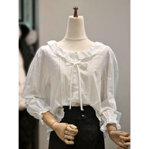[다잇템]여자 크림색 면원단 프릴 레이스 블라우스