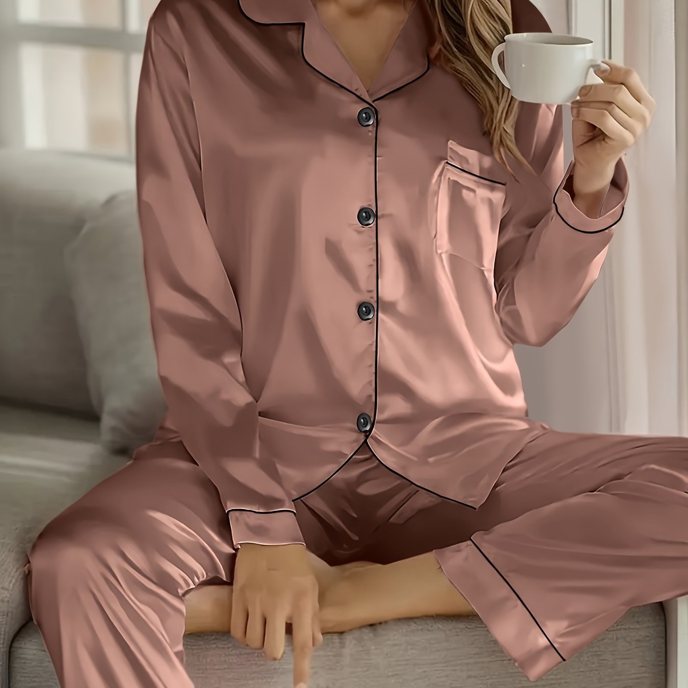 TEMU 여성용 새틴 캐주얼 편안한 1세트 2피스 파자마 세트, 턴다운 칼라 긴팔 상의 & 밴딩 허리 긴바지 여성 파자마 세트