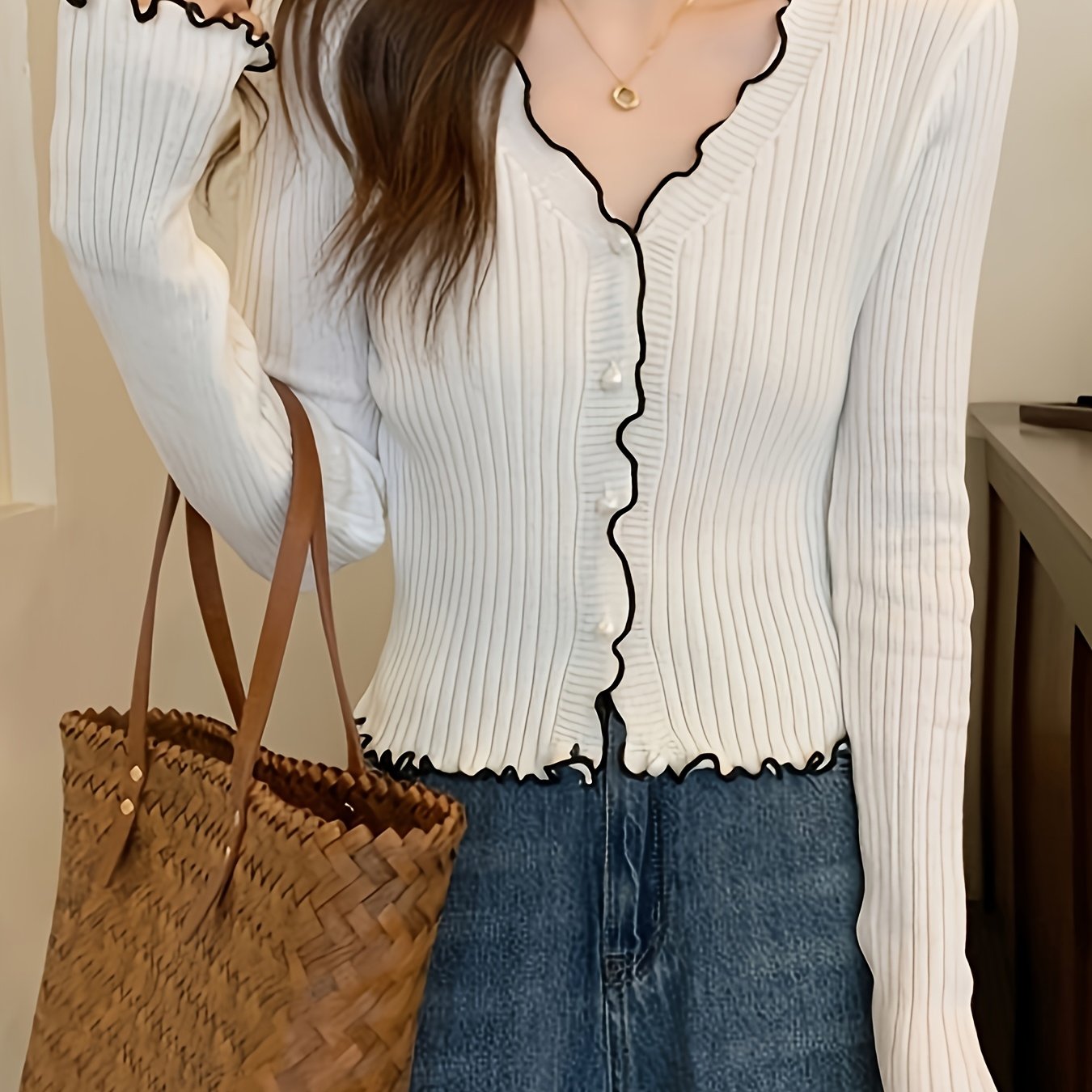 TEMU 탈리스먼드 밑단 퍼지 버튼 프론트 가디건, 우아한 대조 트림 V넥 긴팔 가디건 - 여성용 가을 겨울 의류