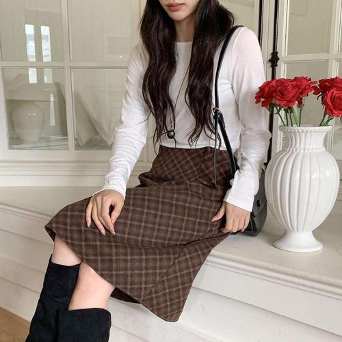 옷자락 / 여성 가을 겨울 체크 무릎미디 스커트