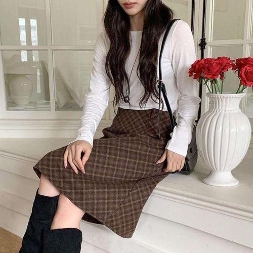 [옷자락]여성 가을 겨울 체크 무릎미디 스커트