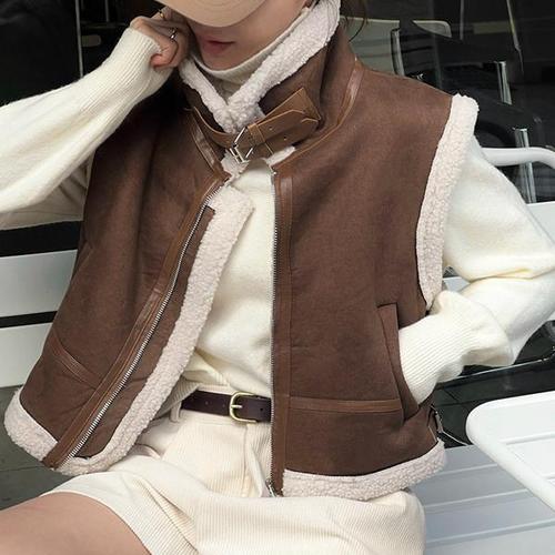 스웨이드 양털 무스탕 버클 하이넥 크롭 조끼 베스트 3컬러