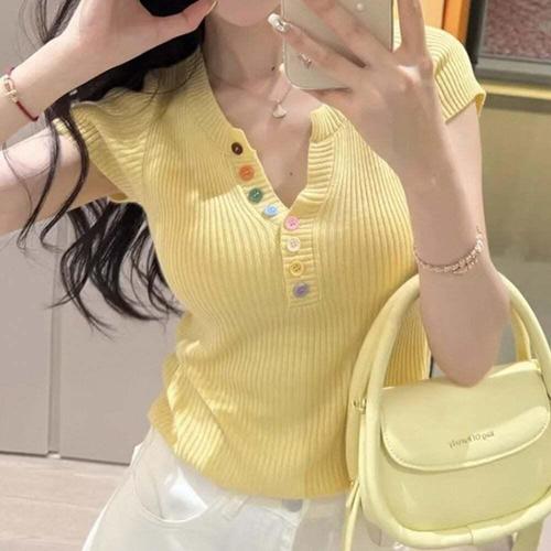 [셀럽하우스]무지개 ULLZ6746 색상 단추 여성 골지 니트티 여름 노랑 반팔티
