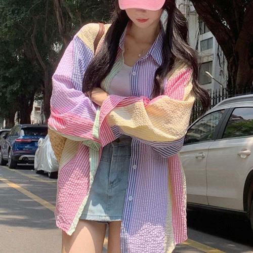 [셀럽하우스]여자 HWMB6905 무지개색 봄셔츠 스트라이프 오버핏 셔츠 가디건