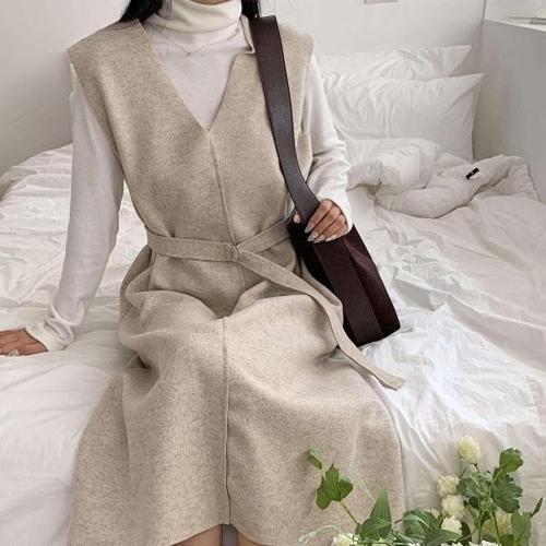 여자 봄 가을 겨울 무지 브이넥 골지 롱 원피스 모임룩 하객룩