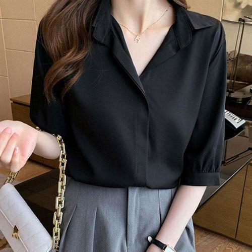 [셀럽하우스]무지 OHKQ8778 심플 5부 소매 쉬폰 셔츠 여름남방 오피스룩