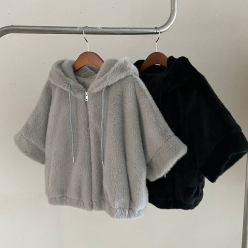 미즈큐즈 / 에코 밍크퍼 후드 페이크퍼 반팔 집업 자켓