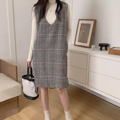 [옷자락]여자 가을 겨울 레이어드 체크 민소매 원피스