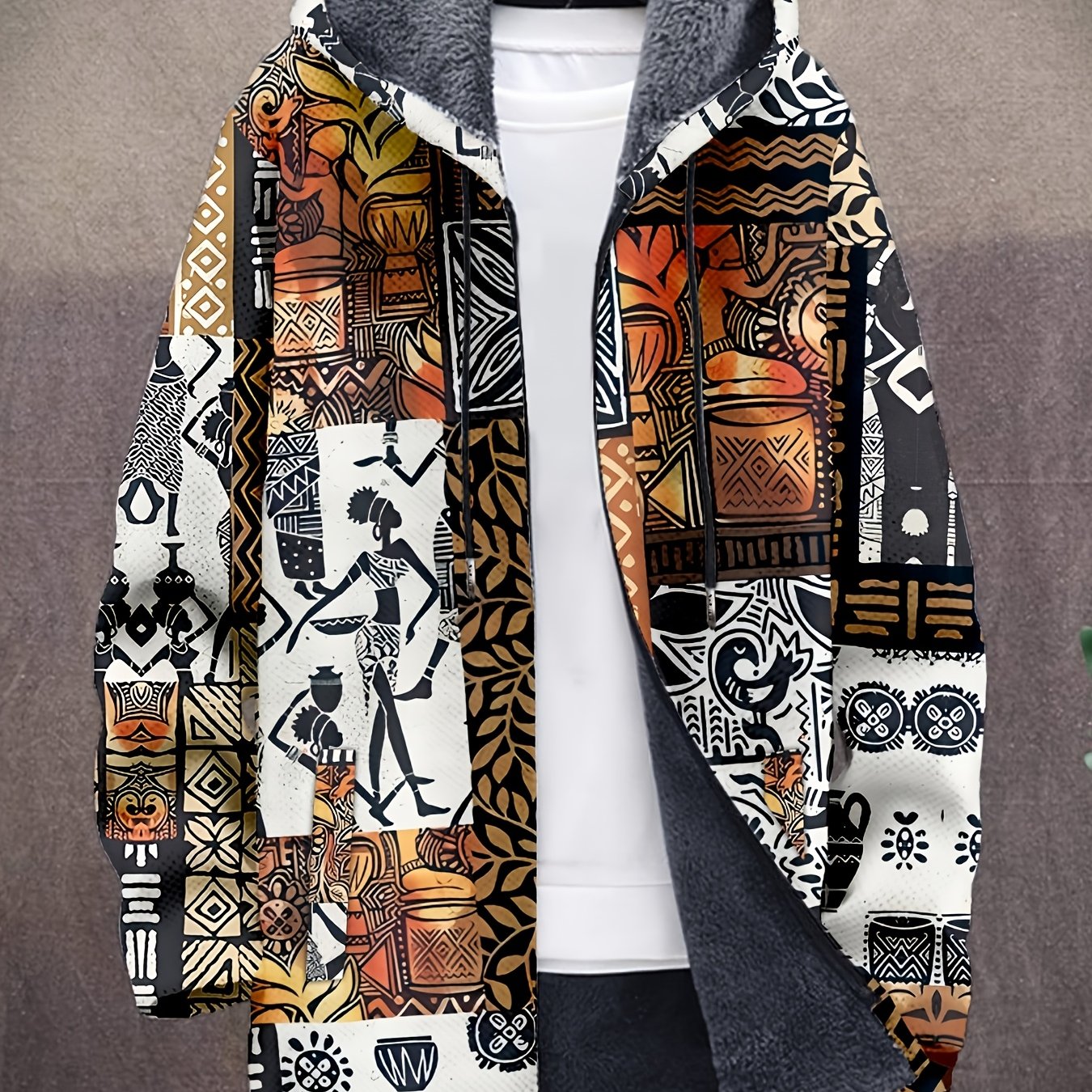 TEMU 빈티지 트라이벌 스타일 아트 디자인 패턴 3D 프린트 패셔너블 남성용 플러시 가디건 두꺼운 겨울 캐주얼 따뜻한 지퍼업 후드 재킷.