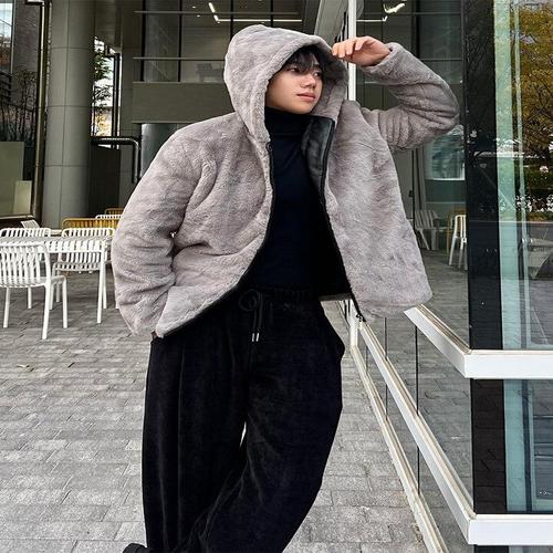 [원스톤]원스톤 밍크 퍼 후드 점퍼 2color 겨울 신상 도톰한 코트 반코트 모피 따뜻한