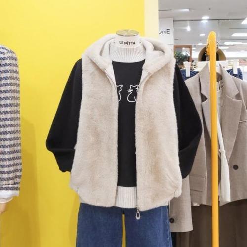 [프리미엄] 낭만고양이 밍크조끼 부드러운 퍼 아우터 모피 후드베스트