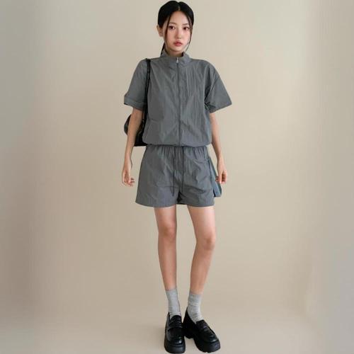 |CMD2686|여성 하이넥 반팔 집업 세트 바스락 반바지 힙무드