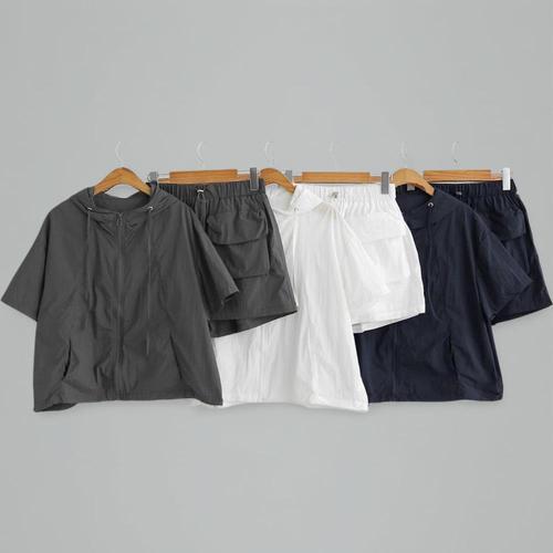 |CMD2686|여자 힙무드 바스락 하이넥 반팔 집업 반바지 세트