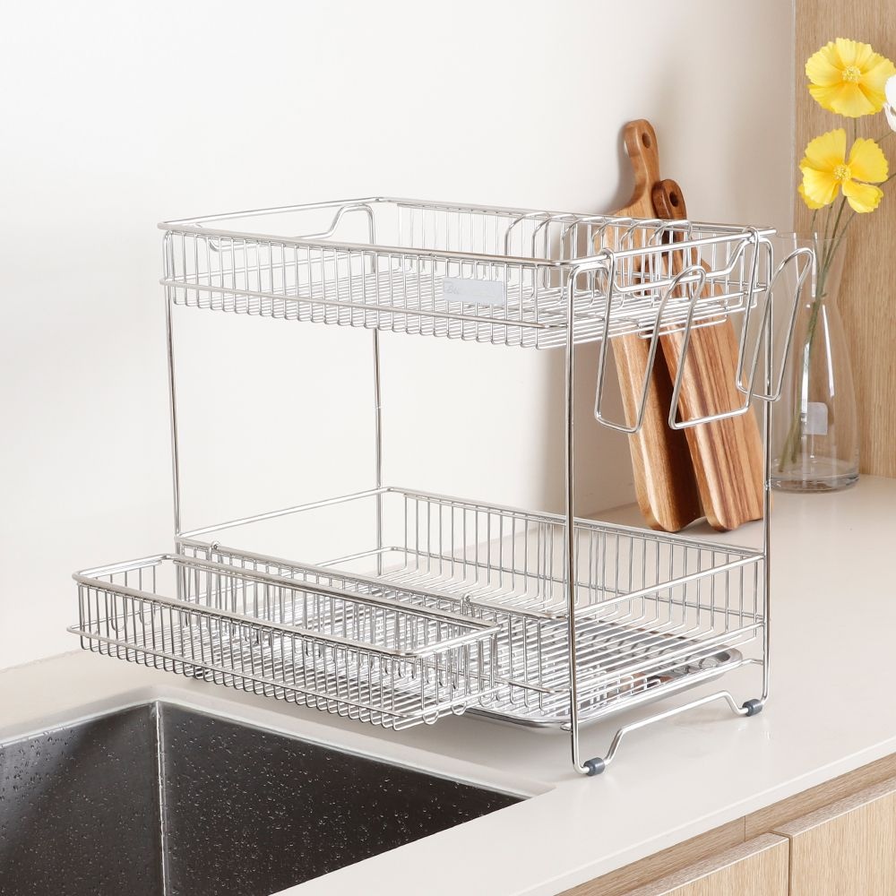 프리미엄 304 올스텐 2단 물빠짐 식기건조대 (접시꽂이+컵걸이+도마거치+다용도바스켓)