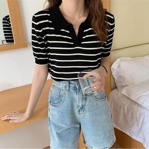 [엄지척]여자 여름 단정한 카라 스트라이프 반팔 니트 티셔츠_19610995_667501