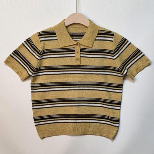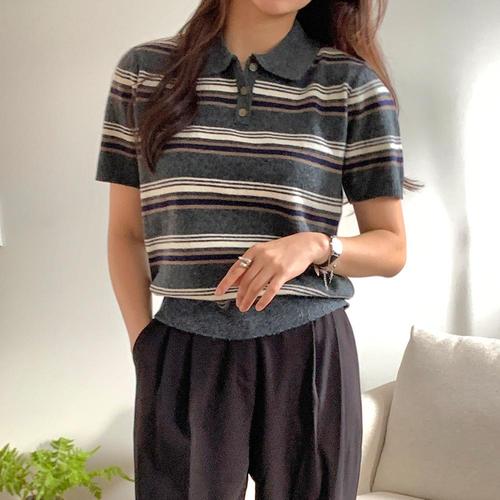 [기타브랜드]투버튼 카라 반팔 스트라이프 니트 여성 의류 봄옷 여름옷 가을옷 데이트룩 나들이룩
