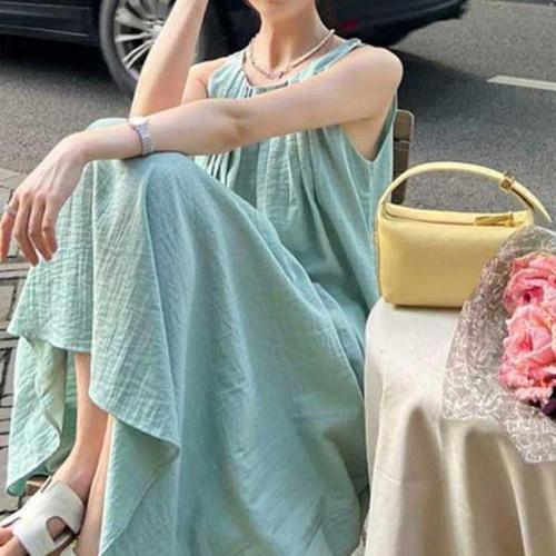 [에이치플러스몰]여성 여름 민소매 라운드넥 바캉스 링클플리 롱 원피스