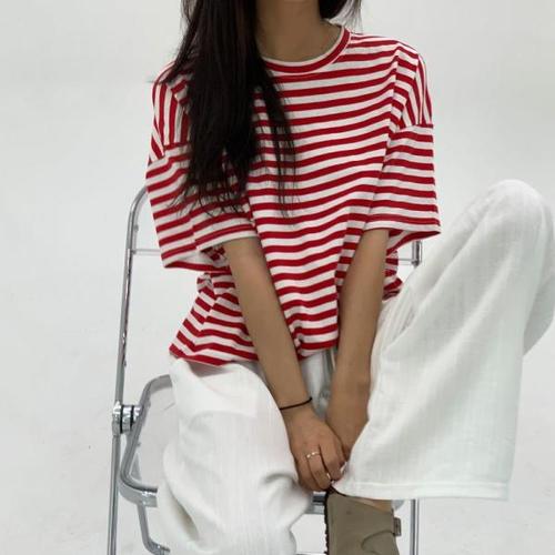 [신상오픈런]스트라이프반팔티 오버핏 캐쥬얼 코튼 순면 박스티