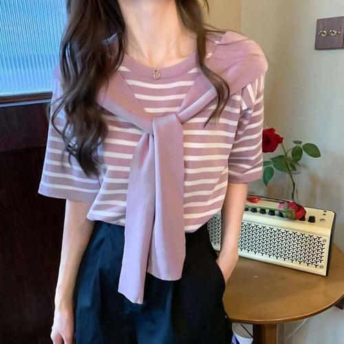 [셀럽하우스]데일리 PCTM9704 스트라이프 여자 페이크 숄 니트 반팔티셔츠