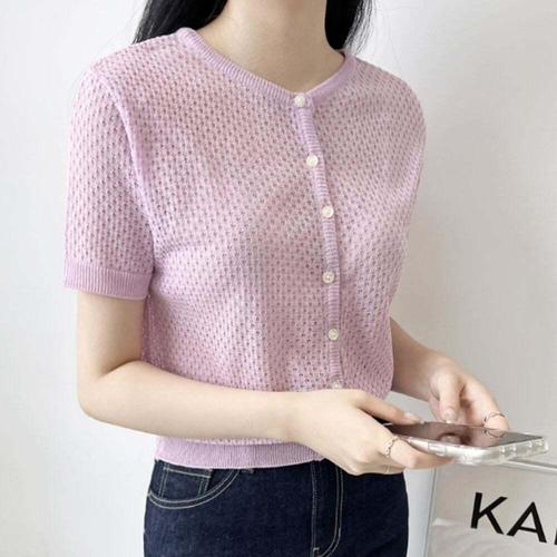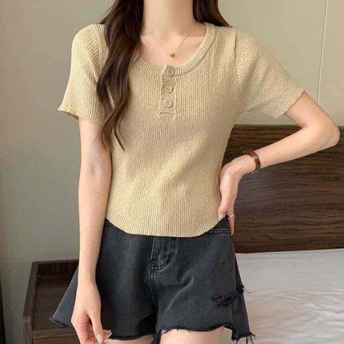 [셀럽하우스]여자 LART9091 여름 데이트 룩 라운드 넥 버튼 반팔 니트 코디