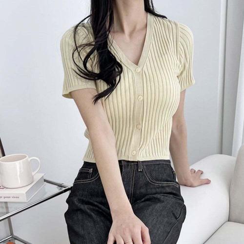 [셀럽하우스]여름철 BMUQ5410 데일리 여성 슬림핏 골지 버튼 반팔 크롭 니트