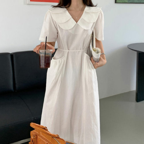 [옷자락]여성용 심플 허리 스트링 카라 반팔 롱 셔츠 원피스
