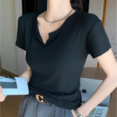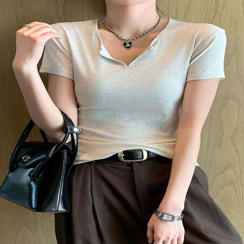 [셀럽하우스]여성 SXSK6937 브이넥티 반오픈 골지 슬림핏 데일리 반팔티셔츠
