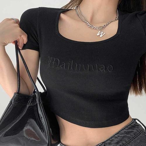 [셀럽하우스]히든 QDQK8139 레터링 자수 스퀘어넥 슬림핏 크롭 반팔티셔츠
