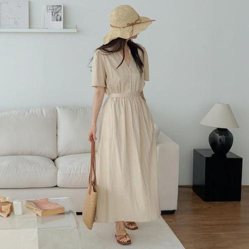 [드리다]여름 바스락 카라 브이넥 플레어 빅사이즈 반팔 롱 원피스