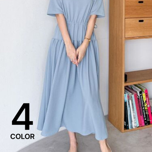 에르디테 / 5부 반팔 허리 끈 주름 롱 원피스 빅사이즈/ 4컬러